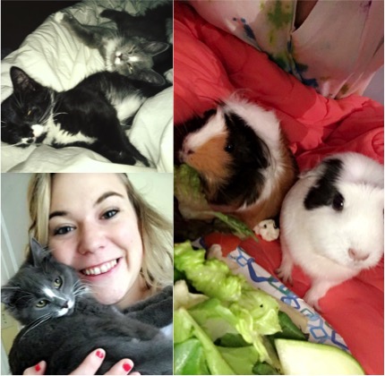 I have two adorable kittens, Athena and Smudge; as well as two spunky guinea pigs, Maryanne and Wanda. They love hanging out together, and curling up for a nap!
