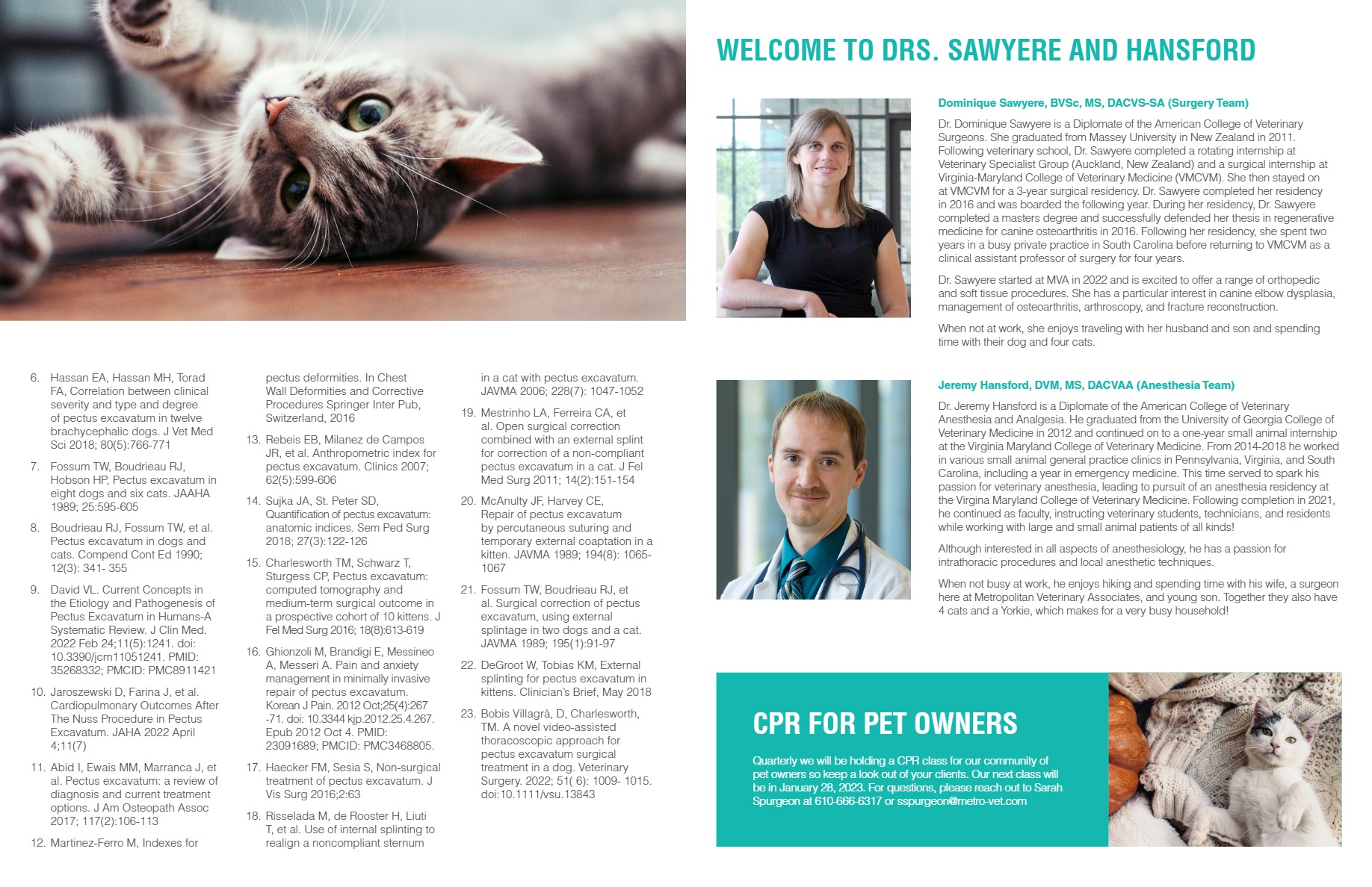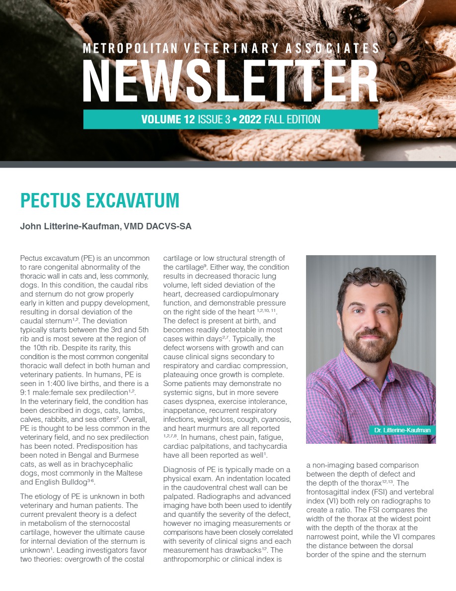 One of our surgery specialists, Dr. John Litterine-Kaufman speaks about pectus excavatum (PE), an uncommon to rare congenital abnormality of the thoracic wall in cats and, less commonly, dogs. We would also like to welcome Drs. Sawyere and Hansford to our team.