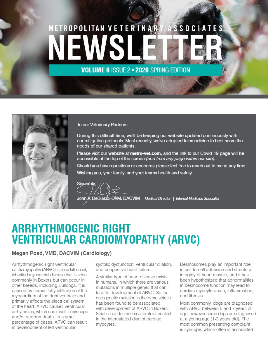Arrhythmogenic right ventricular cardiomyopathy (ARVC) is an adult-onset, inherited myocardial disease that is seen commonly in Boxers but can occur in other breeds, including Bulldogs