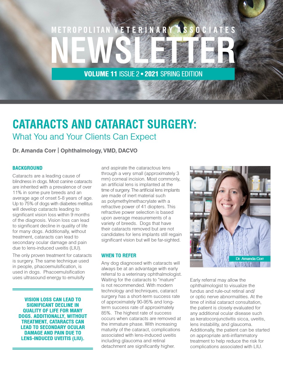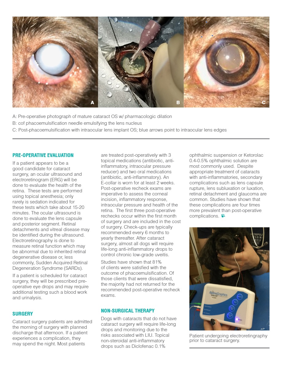 One of our ophthalmology specialists, Dr. Amanda Corr speaks about cataracts and cataract surgery in dogs. Cataracts are a leading cause of blindness in dogs. Most canine cataracts are inherited with a prevalence of over 11% in some pure breeds and an average age of onset 5-8 years of age. Up to 75% of dogs with diabetes mellitus will develop cataracts leading to significant vision loss within 9 months of the diagnosis.